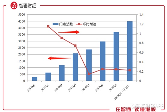 具体参考瑞幸的运营和财务指标,首先从扩张速度看,2018年通过首杯免费、大力度的折扣等活动,市场迅速扩张,进入2019年,除了Q1受到假期影响影响之外,总体上环比增速是持续下滑的,Q3季末达到3680家,而且根据之前的指引,预计2019年末将达到4500家,当前的环比增速稳定在22%左右的水平,预计该水平将会持续一段时间。