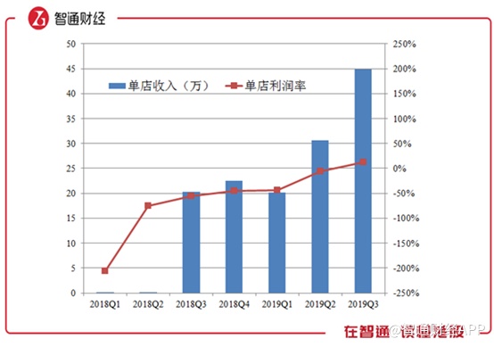 从单个店面的运营情况来看,智通财经APP发现,2019Q2以来又连续两季取得了明显增长,而利润率也终于在Q3实现了由负转正,虽然整体上公司仍在亏损,不过这不得不说是一个转折点,从前文我们知道总体的亏损幅度其实是有所缩窄的,这是因为在经历了去年的极速扩张和大规模营销之后,公司的营销费用从2018Q4开始下降,而2019Q3又有所上升,是因为7月份公司推出新品小鹿茶,从而增加了营销费用。