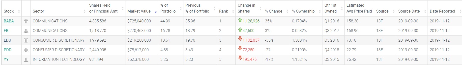 智通财经APP获悉,根据美国证监会(SEC)披露,景林资产管理公司于11月12日递交了截至2019年9月30日的三季度(Q3)持仓报告(13F)。