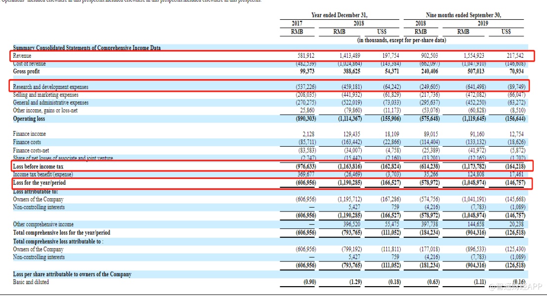 招股书显示,2017年、2018年及截至2019年9月30日止9个月,壹账通的营收分别为5.82亿元、14.13亿元和15.55亿元增长迅速。但由于研发费用、营销费用、一般及行政开支占营收比重较大且总体呈快速增长,使得公司长期未能实现盈利。
