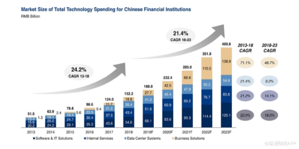 好在中国作为全球第二大经济体,金融业正在蓬勃发展。金融业的发展,为金融服务市场带来飞速发展机遇。根据奥纬咨询(Oliver Wyman)的数据,2018年中国金融机构的技术支出市场为1522亿元,预计到2023年将以21.4%的复合年增长率增长至4008亿元。