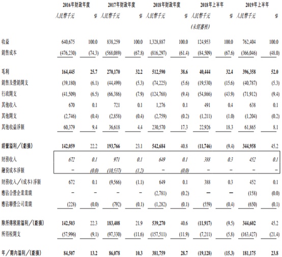 于相同期间,公司的毛利分别为人民币1.64亿元、人民币2.7亿元、人民币5.13亿元和人民币3.96亿元,对应毛利率分别为25.7%、32.2%、38.6%和52%。公司的毛利由2018年上半年的人民币4040万元增加人民币3.56亿元或881.2%至2019年上半年的人民币3.96亿元。公司的毛利率由2018年上半年的32.4%上升至2019年上半年的52.0%,主要由于景业荔都第二期及景业清水湾3号第三期导致物业开发及销售分部的毛利率由2018年上半年的43.0%上升至2019年上半年的54.8%。