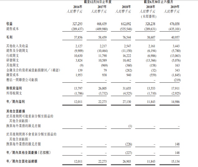 截至2016年、2017年及2018年12月31日止年度,总体毛利分别为人民币3786万元、人民币5846万元及人民币7654万元,总体毛利率分别约为11.6%、12.5% 及12.5%。截至2018年及2019 年6月30日止六个月,毛利分别为人民币3860万元及人民币4096万元,总体毛利率分别约为11.8%及8.6%。