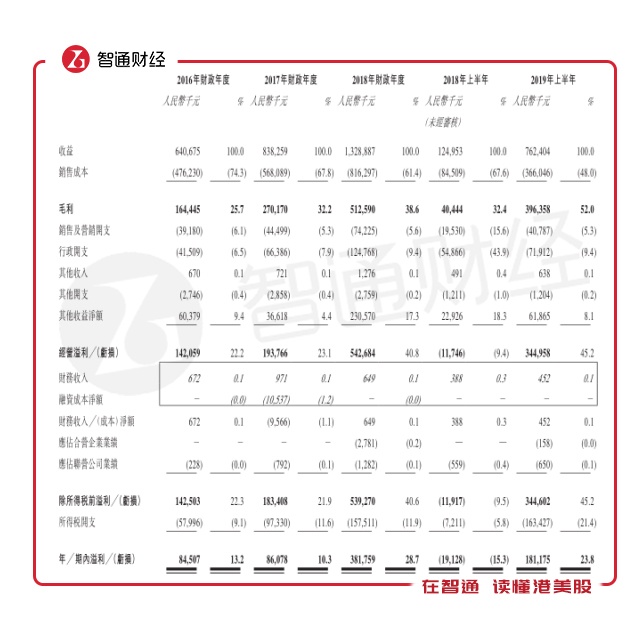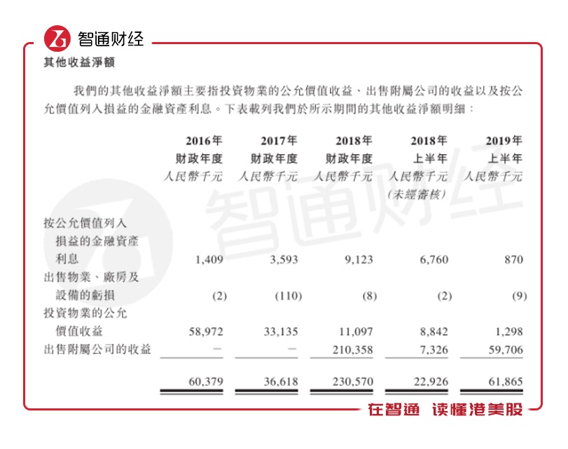 而且公司利润增幅最大的2018年,出售附属公司收益贡献了不少。智通财经APP了解到,2016-2018全年及2018、2019上半年,公司毛利分别为1.64亿元、2.7亿元、5.13亿元、4044万元、3.96亿元,对应毛利率25.7%、32.2%、38.6%、32.4%、52%;最终净利润分别录得8450.7万元、8607.8万元、3.82亿元、-1912.8万元、1.81亿元,对应净利润率分别为13.2%、10.3%、28.7%、-15.3%、23.8%。