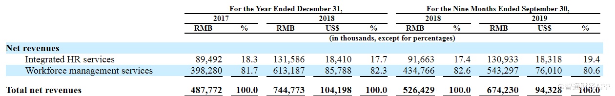 即使劳动力管理服务的盈利水平较低,但该业务的规模仍在持续扩张。2018年时,该业务的收入为6.13亿人民币,同比增长54%。但至2019年前三个季度,该业务增速下滑至22.9%,增速减半。
