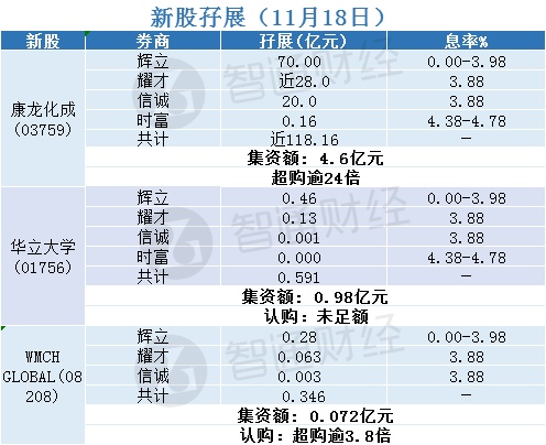 截止至11月18日,辉立、耀才、信诚、时富分别为上述公司借出近118.16亿港元、0.591亿港元、0.346亿港元。其中康龙化成超购逾24倍,WMCH GLOBAL超购逾3.8倍,华立大学未足额。