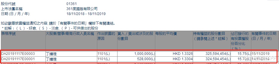 智通财经APP获悉,联交所最新资料显示,11月14-15日,主席丁辉煌分别增持361度(01361)52.8万、100万股,每股作价分别为1.3304港元及1.3326港元,总金额约为203.51万港元。增持后最新持股数目约为3.26亿股,最新持股比例为15.75%。