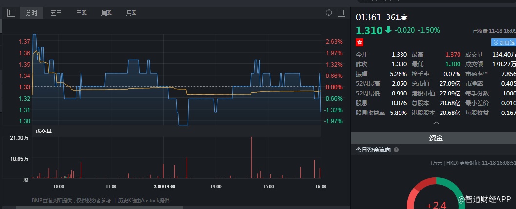 截至今日收盘,361度(01361)跌1.50%,报1.31港元。
