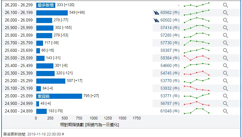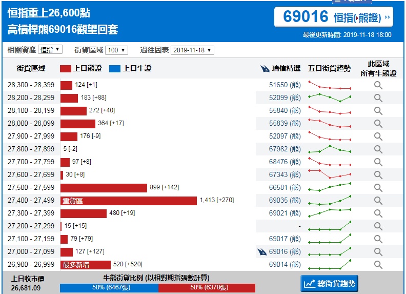 智通财经APP获悉,截至11月18日,恒指最新的牛熊街货比例50:50。瑞信恒指牛熊证街货分布图中的数据显示,熊证街货重货区在27400-27499区间,该区间最新熊证数量为1413张,较上一交易日增加270张,最多新增在26900-26999区间,较上一交易日增加520张。牛证街货重货区在25000-25099区间,该区间最新牛证数量为795张,比上一交易日增加27张;最多新增在26200-26299区间,较上一交易日增加120张。