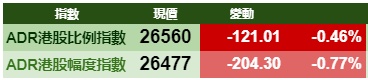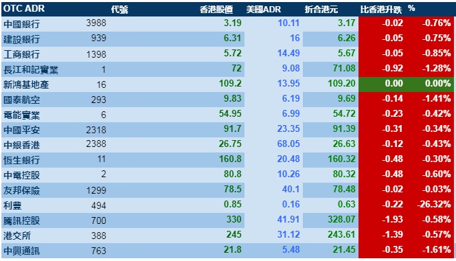 智通财经APP获悉,美股再创新高,但港股ADR指数全日表现弱势,按比例计算,收报26560点,跌121.01点或0.46%。大型蓝筹几乎全线下挫,汇丰控股收报58.3元,较港收市升0.1元;腾讯控股收报328.07元,较港收市跌1.93元。