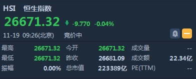 智通财经APP获悉,恒生指数开盘微跌0.04%,报26671.32点。国企指数跌0.24%,报10531.38点。红筹指数跌0.51%,报4248.46点。大市盘前成交22.34亿港元。