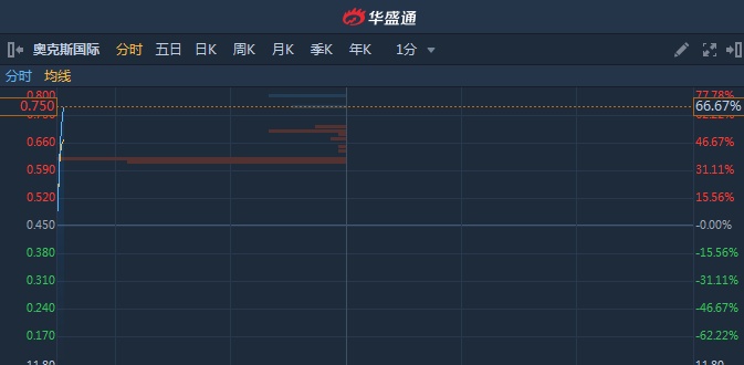 智通财经APP获悉,奥克斯国际(02080)昨日(11月18日)发盈喜,中期盈利同比预增逾4倍,受利好消息刺激,早盘股价急升,截至9时32分,涨66.67%,报0.75港元,成交额17.65万。