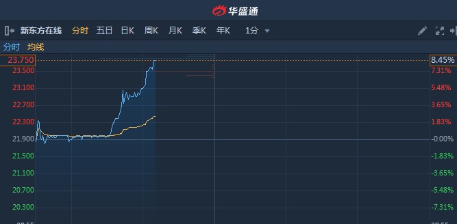智通财经APP获悉,新东方在线(01797)获南下资金青睐,港股通持股比例达7%,利好消息助力股价延续升势,盘中一度高见23.75港元,再创上市新高,截至11时09分,涨8.45%,报23.75港元,成交额1.073亿。