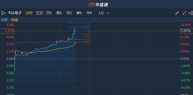 智通财经APP获悉,TCL电子(01070)近日与Netflix(NFLX.US)携手再续全球合作协议。利好消息刺激股价连续走高,盘中突破多条均线,截至11时30分,涨8.45%,报3.72港元,成交额716.53万。