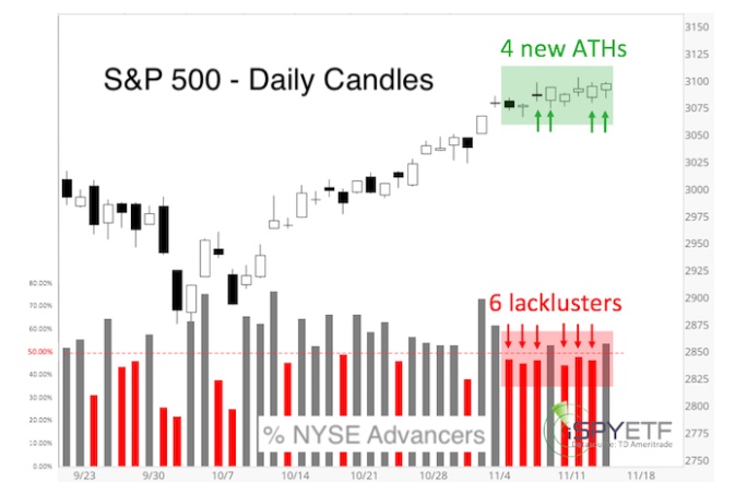 在过去的两周内,标准普尔500指数四次创下新高。但是在指数不断走高的情况下,有六天市场中下跌股票的数量却多于上涨的股票。