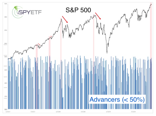 下图可以帮助大家清楚的看出,在标普500指数达到历史新高时,股市内有多少股票在上涨,多少股票在下跌。下图底部出现蓝色线条意味着当天股市内下跌的股票多于上涨的股票,蓝线越高,说明当日下跌的股票越多。出现蓝色的线条那天将其称为“低迷”。