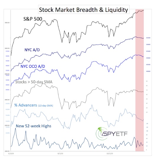 在内部普遍恶化的情况下,上周市场还出现了一些新指标,这些指标使得标普500无法再创新高的同时,还导致了一些空头的诞生。这些指标分别是累积纽约综合指数腾落指数(A/D线),超过其50天SMA均线的股票百分比,创下52周新高的RSI-14和RSI-35均线。