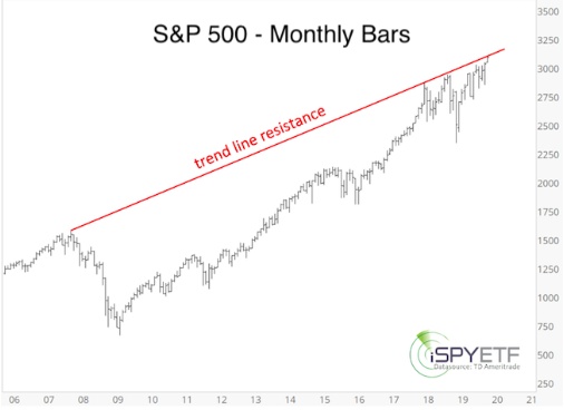 标普500指数再次达到的压力线。过去12年,趋势线的压力一直在保持。
