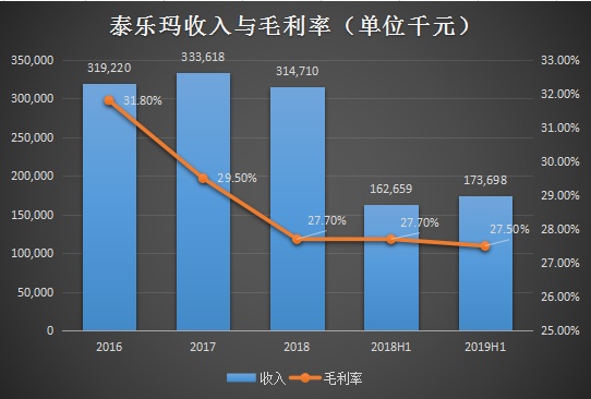 从招股书披露的收入情况可以看到,这个号称在欧洲和中国市占率第一的公司,年收入仅仅3.2亿元左右。可以想象到这个市场规模其实并不大,并且从近三年的收入情况来看,泰乐玛也并没有稳定的增长趋势,2018年收入同比下跌5.7%。