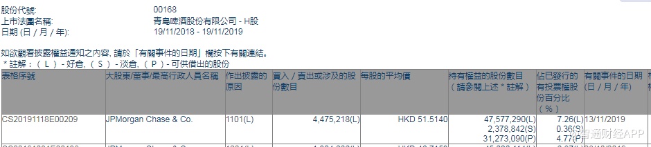 智通财经APP获悉,联交所最新资料显示,11月13日,青岛啤酒(00168)获摩根大通增持447.52万股,每股作价51.5140港元,总金额为2.3亿港元,增持后最新持股数目约为4757.73万股,最新持股比例增至7.26%。