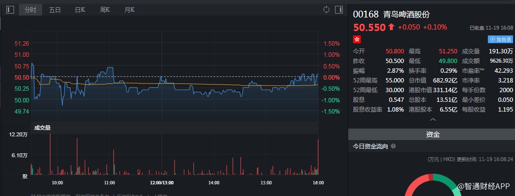 截至今日收盘,青岛啤酒涨0.10%,报50.55港元。