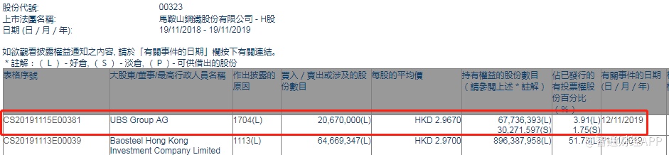 智通财经APP获悉,联交所最新资料显示,11月12日,瑞银减持马钢股份(00323)2067万股,每股作价2.967港元,总金额约为6132.79万港元。减持后最新持股数目约为6773.64万股,最新持股比例为3.91%。