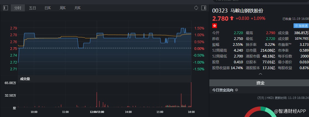 截至今日收盘,马钢股份(00323)涨1.09%,报2.78港元。