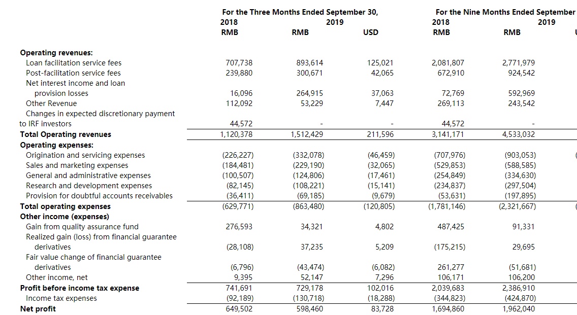 财报显示,拍拍贷本季度营收为15.1亿人民币(2.11亿美元),同比增长35%。拍拍贷三季度的运营支出为8.63亿人民币(1.2亿美元),同比增长37%。期间归母净利润为5.97亿人民币(8370万美元)。同比降低7.9%。摊薄后每股收益为0.37元人民币或0.053美元,去年同期为0.41人民币。摊薄后每ADS收益为1.89元人民币或0.26美元,去年同期为2.06元人民币。