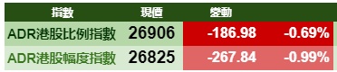 智通财经APP获悉,美股窄幅震荡,三大指数涨跌不一,港股ADR指数全日表现弱势,按比例计算,收报26906点,跌186.98点或0.69%。大型蓝筹全线下挫,汇丰控股收报58.61元,较港收市跌0.24元;腾讯控股收报335.18元,较港收市跌1.42元。