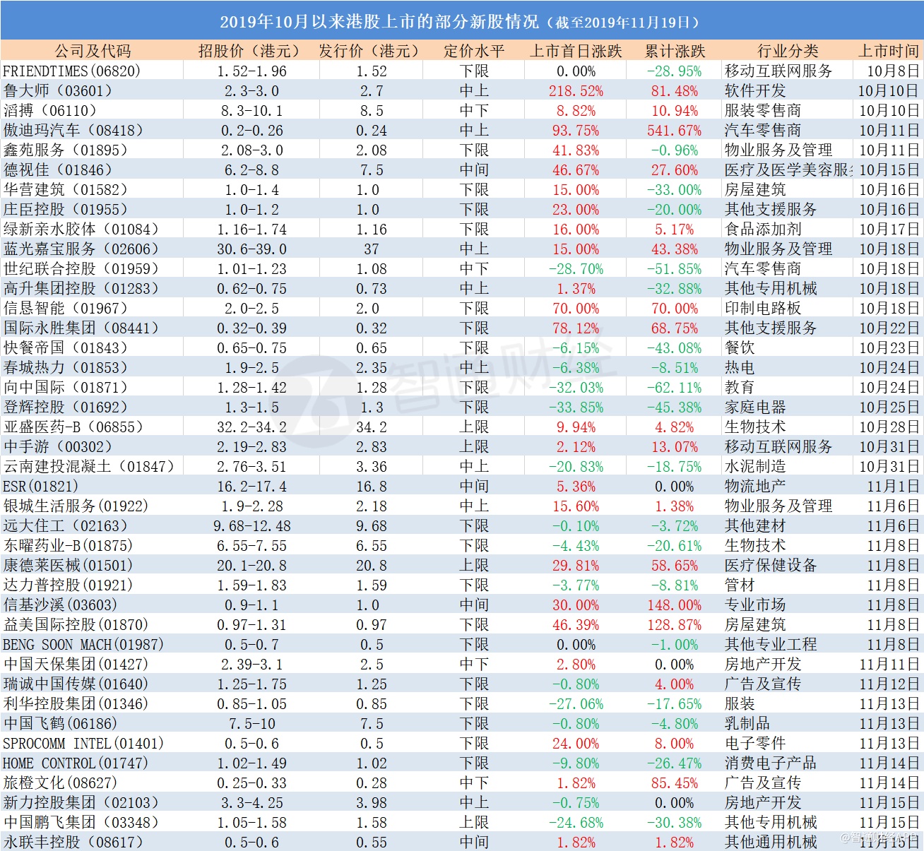 时间走到2019年11月中下旬,港股继续向全球IPO集资王冲刺。反观新股表现,智通财经APP注意到,最近上市的新股明显不如人意,大部分发行价定在招股价的下限,基本上是“上市一个,破发一个”的节奏,10月炒新热潮下暴涨的新股也逐步回归理性。