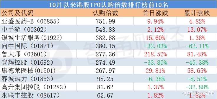 认购倍数方面,41只新股中,亚盛医药-B以高达751.99倍的认购倍数,喜提“年度认购王”的称号,其一手中签率仅9%。中手游(00302)、银城生活服务(01922)的认购倍数紧随其后。