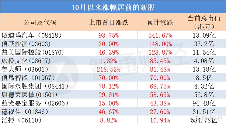 近两个月上市的次新股中,累计涨幅最高的是傲迪玛汽车(08418),现已涨逾540%。这家公司是新加坡的一站式汽车售后服务提供商,10月11日以创业板形式上市。2016-2018年收入分别为新加坡元1633万元、1864万元、1798万元,纯利分别为新加坡元142万元、190万元、-24万元,今年前三季度由于售予缅甸客户的乘用车零部件及配件增加,公司扭亏为盈。傲迪玛汽车资本负债比率高,经营活动现金流为负,目前市值仅13亿港元。