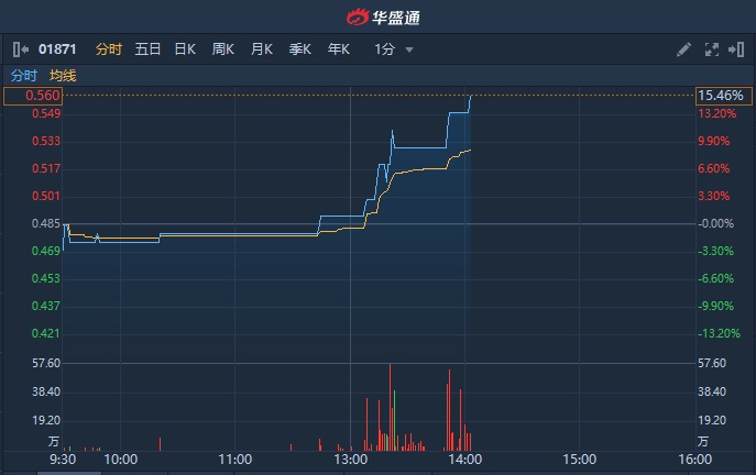 智通财经APP获悉,向中国际(01871)自10月24日上市以来,股价持续阴跌。今日午后飙升超15%,盘中高见0.56港元,较招股价1.28港元仍低近六成。截至发稿,涨15.46%,报0.56港元,成交额300.11万港元。