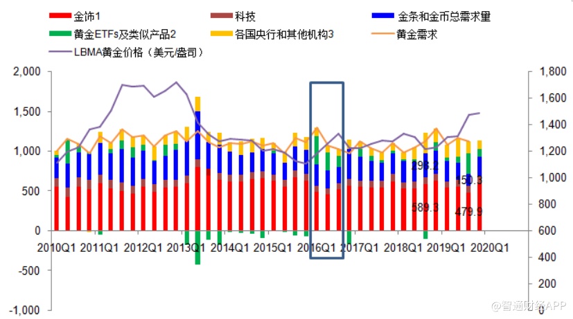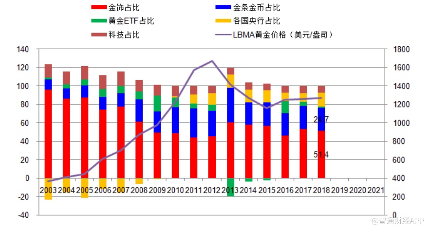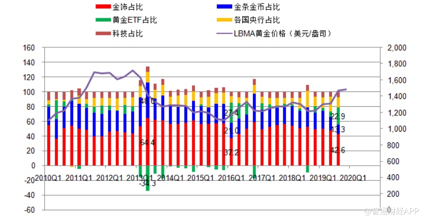 我们知道,黄金的供给是非常稳定的,金价的变化主要来自需求。黄金的需求主要有五部分,分别是金饰、金条金币、黄金ETF、央行、科技。科技需求高度稳定,可以忽略。本文用到的黄金需求量数据来自世界黄金协会。