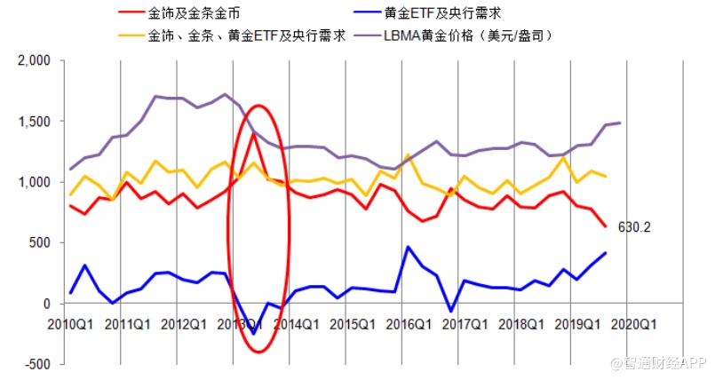 1、2013年消费需求提升,但为什么金价在2015年末才见底而不是更早?是消费需求恢复的太慢,还是黄金ETF的赎回迟迟不结束?
