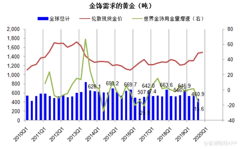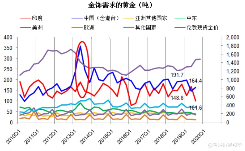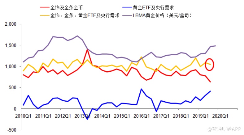 在这里,金饰、金条需求在一点上是高度相似的,就是黄金价格变化决定这类需求的变化。