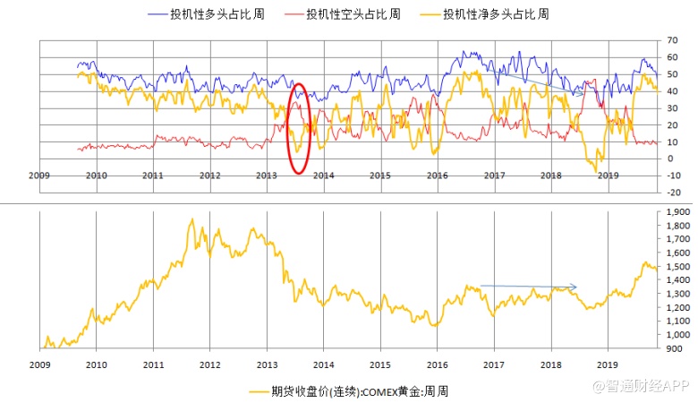 具体以2013年金价大跌为例(见下图)。2013年一季度,发达经济体逐渐走出欧债危机,国债被减持,美元实际利率回升,黄金ETF被投资者大幅减持并导致黄金总需求回落,金价大跌。金价的暴跌导致中印两国的消费者掀起了“抢金潮”。2013年二季度的金饰金条消费量比2012年四季度大涨了500吨,而黄金ETF在此期间从申购到赎回的差值也有500吨。投资者对黄金ETF的减持遇到消费者巨大的消费支撑,金价下跌的速度开始放缓。黄金期货参与者显然注意到了这种下跌的阻力在加大。在2013年7月,黄金的投机性空头开始减少,投机性净多头占比触底回升,金价出现第一次月度级别的反弹。虽然2014、2015年的金饰消费因为“抢金潮”的透支而减弱,但是随着金价进一步的下滑,金饰消费量维持在之后几年未达到的高位。