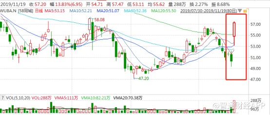 58同城的这份营收业绩,超过了此前公司42亿元的指引上限。因此华尔街也非常慷慨地为公司的这份财报予以肯定。11月19日收盘,58同城收涨13.83%,收盘价达每股57.2美元,成功止跌。