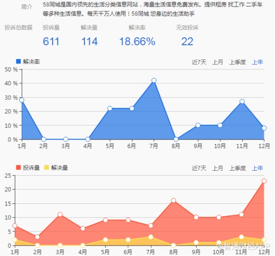 根据聚投诉统计数据显示,2018年,58同城在聚投诉上的收到的投诉额为611件,解决率为18.66%。这说明58同城还是没有跳出“信息分发染纠纷”的圈子。