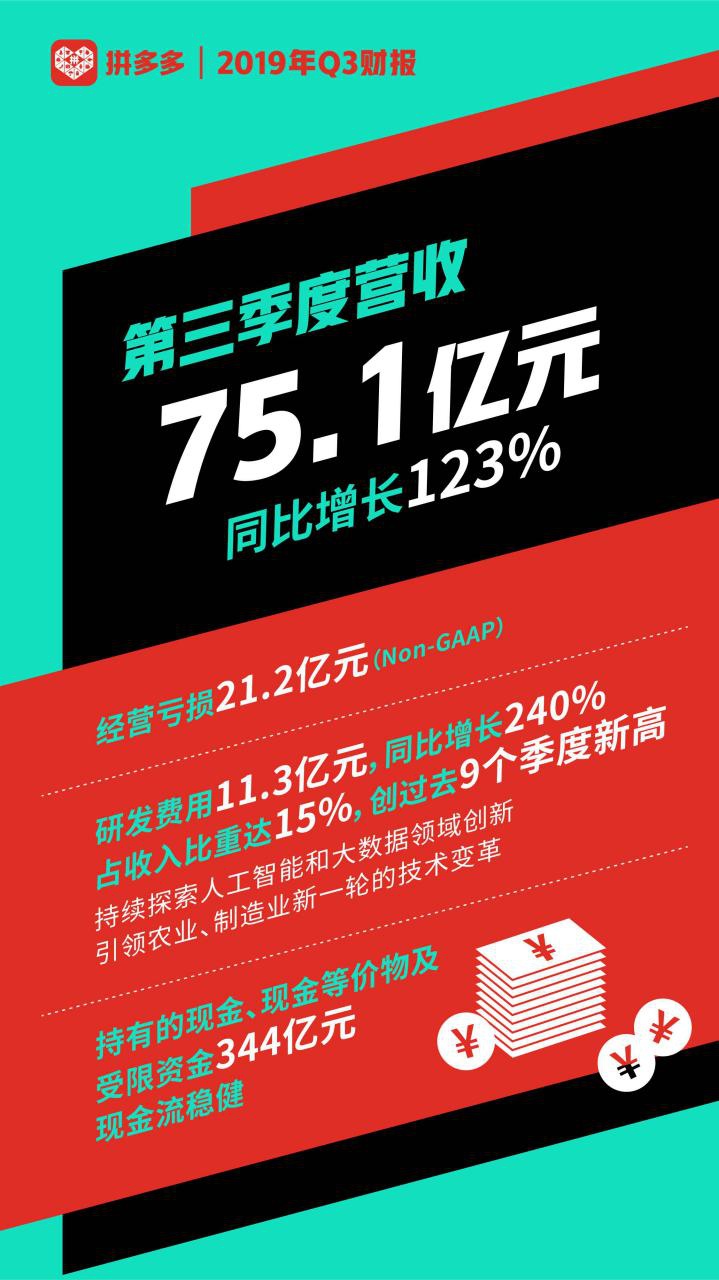 财报显示,三季度,拼多多实现营收75.139亿元,较去年同期的33.724亿元同比增长123%。
