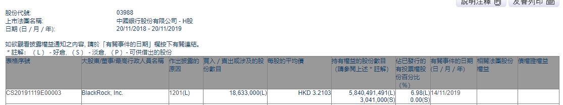 智通财经APP获悉,联交所最新资料显示,11月14日,贝莱德减持中国银行(03988)约1863.3万股,每股作价3.210港元,总金额约5981万元。减持后最新持股数目约为58.4亿,最新持股比例为6.98%。