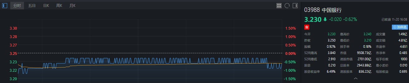 截止至11月20日收盘,中国银行跌0.62%,每股报价3.230港元。