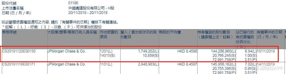 智通财经APP获悉,联交所最新资料显示,11月15日,摩根大通减持中国铁建(01186)174.92万股,每股作价8.459港元,总金额约为1479.65万港元。减持后最新持股数目约为1.44亿股,最新持股比例为6.94%。