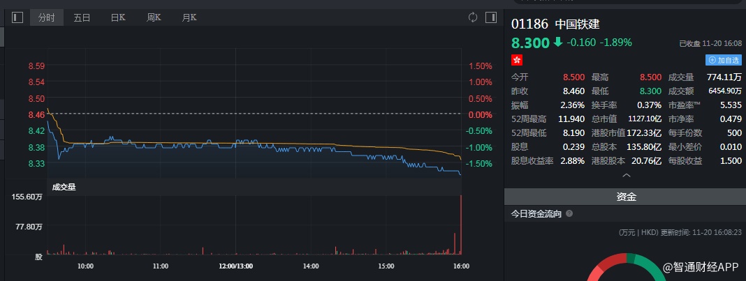 截至今日收盘,中国铁建(01186)跌1.89%,报8.30港元。