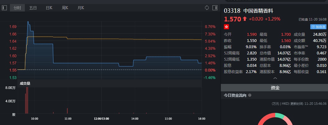 截至今日收盘,公司涨1.29%,报1.57港元。
