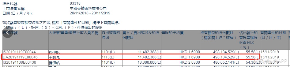智通财经APP获悉,联交所最新资料显示,11月15日,中国香精香料(03318)主席兼行政总裁王明凡增持1148.24万股,每股作价为1.69港元,总金额约为1940.53万港元,增持后最新持股数目约为4.98亿股,最新持股比例为55.58%。