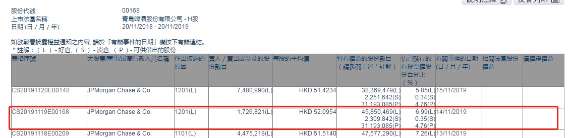 智通财经APP获悉,联交所最新资料显示,11月14日,摩根大通减持青岛啤酒(00168)172.68万股,每股作价52.0954港元,总金额约为8995.94万港元。减持后最新持股数目约为4585.04万股,最新持股比例为6.99%。