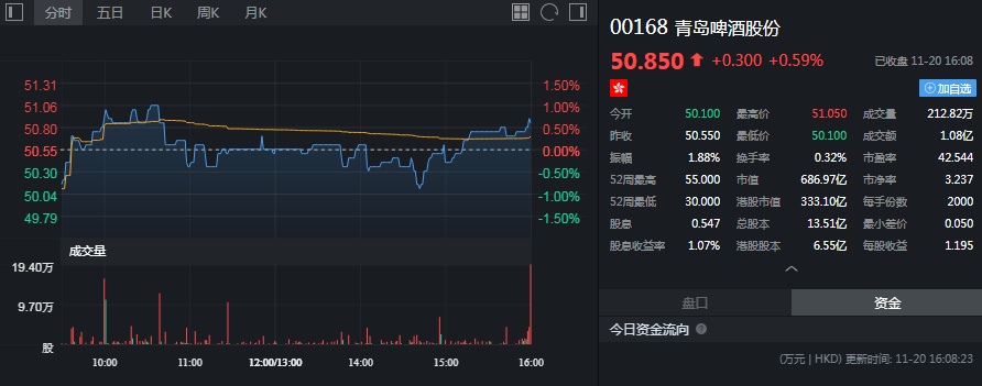 截至今日收盘,青岛啤酒(00168)涨0.59%,报50.85港元。