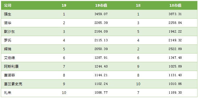 美国 GEN(基因工程和生物科技新闻杂志)于 18 日发布了今年市值最高的全球 10 大制药公司名单: