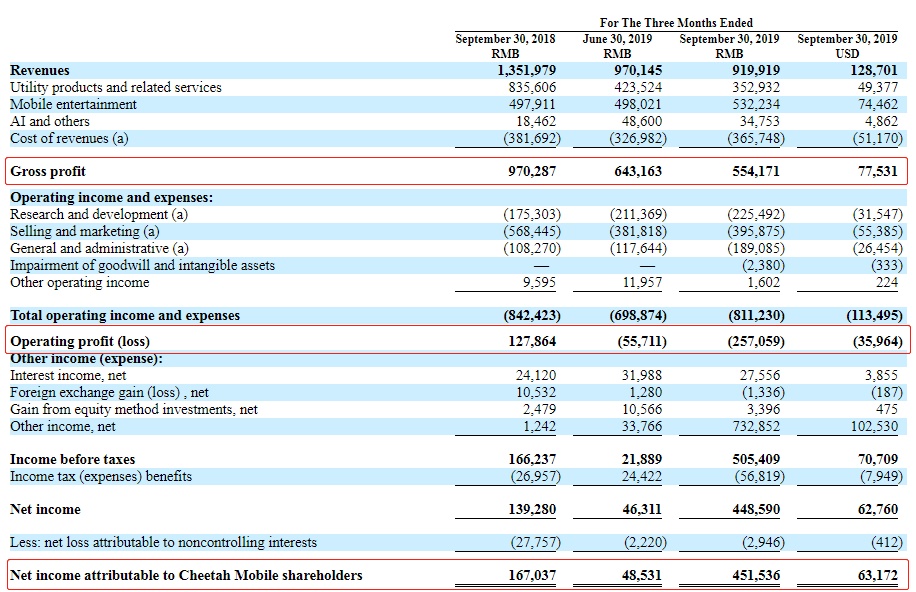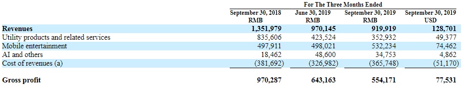 从上图可以看到,正因为实用产品与服务下跌,移动娱乐在2019年二季度“荣登”猎豹收入台柱,并且在三季度拉开距离。然而,移动娱乐业务只是同比增长了6.9%。